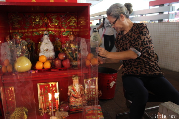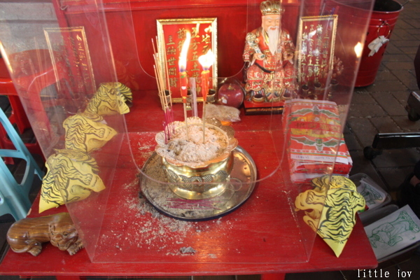 看婆婆打小人那力道之強,我都嚇壞了,打完後,婆婆和藹可親地拿香給我讓我跟神明拜拜,拜完她再將金紙跟紙人偶一起焚燒,然後拿筊給我要我躑筊,跟剛剛打小人的專注與「用力」差好多,婆婆還說一次就有一正一反的聖筊,表示小人都打掉了,超酷的!
